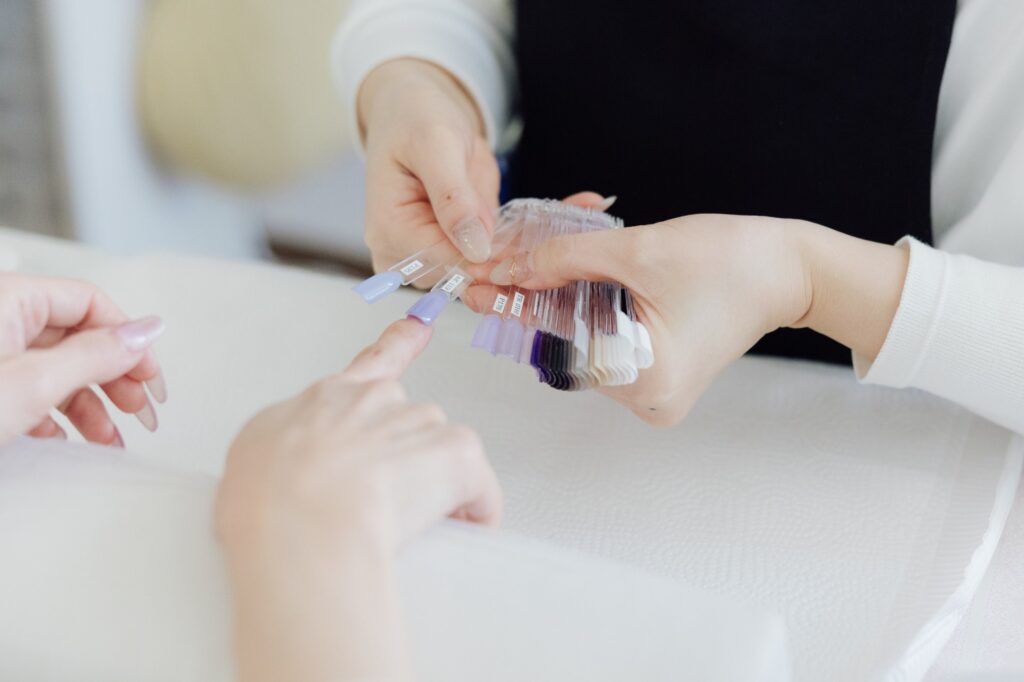 ジェルネイルを削り、爪の形を整え、甘皮を綺麗に取ったら、ネイルのカラーとデザインを選びます。